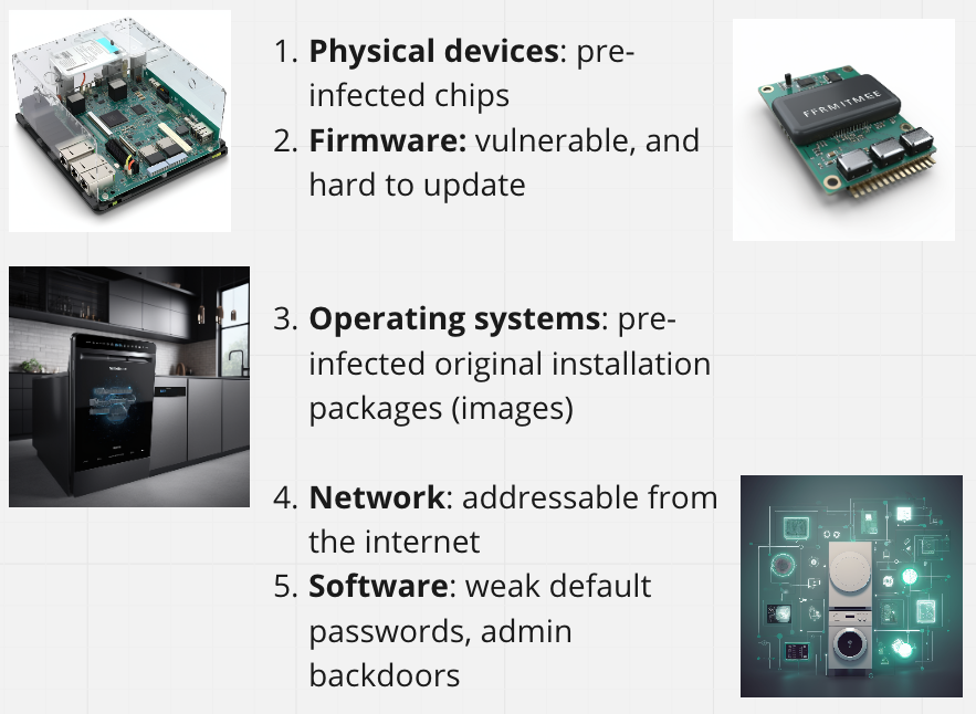 Nation states such as China use their manufacturing power to implant backdoors into routers and smart appliances. The infected devices become "stepping stones" to target domestic infrastructures by appearing to come from local soil. The "Volt Typhoon" group, which specializes in stealth government operations, likely uses these pre-infected devices.