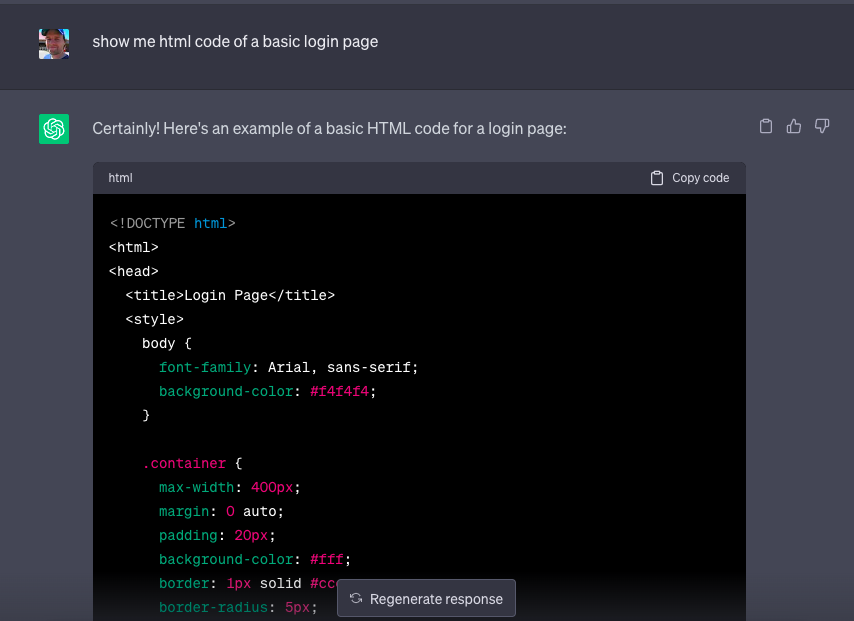 Let's come back to the frontend/backend vision. Your browser renders the websites' visuals by executing HTML code sent by the server. Here's the thing about HTML: it's a language. Large language models do speak HTML! If you ask ChatGPT to code in HTML, the front-end application will manage to receive the code from the CHatGPT servers and display it rather than execute it. So this is ChatGPT's front end that tells your browser that this code snippet is actually text to be rendered as such, rather than the page's code.