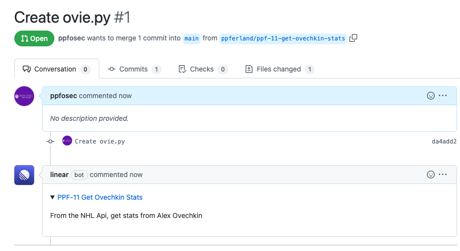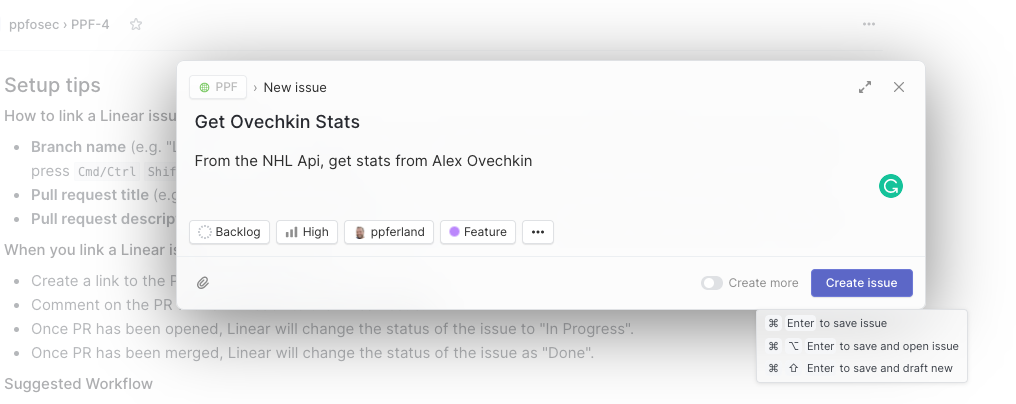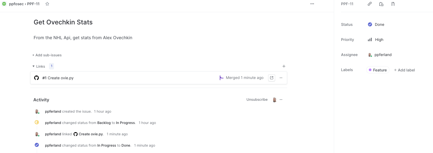But Linear is meant for one thing above all: development. I dusted off my GitHub account, connected it to Linear in less than a minute and created an issue. I built a Python script to fetch Alex Ovechkin's latest NHL Goals in Vs Code and created a pull request with the Linear issue name. Linear updated the issue as "In Review" automatically, and when I merged the PR, Linear set the issue as Done. It's so rapid and crisp. I screenshot the workflow and you can also appreciate the lean interfaces. There are no cluttered fields, only the essentials.