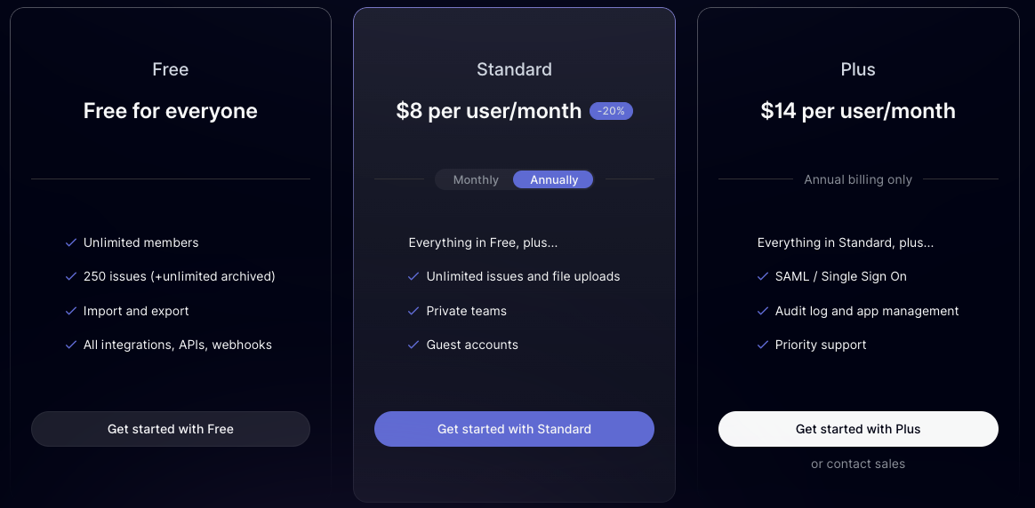 The pricing is very fair. The free plan is surprisingly for unlimited members but 250 issues are something a team can hit within weeks. I had 21 issues with website creation tasks and a 16-line Python script.