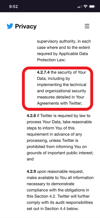 Things were pretty bare in the ToS security-wise so I went a bit out of the box and found Twitter's standard Global Data Processing Addendum (DPA) for its partners. A DPA is basically the "GDPR contract" where companies agree on how personal data will be shared between them and their respective responsibilities towards privacy rights: who gathers consent, who enforces the right to be forgotten, the right to accessibility, foreign data transfers, and... "technical and organizational measures" a.k.a Security. Technical and organizational measures (I call them TOMs) are basically GDPR Article 32 copy-pasted. When a company feeds you Article 32 verbatim in a DPA it is usually what I call, pardon my French, compliance bullshit. And this is what Twitter has in its DPA (see below). The funny thing is that Twitter refers to "Your Agreements", which I could not find a copy of!