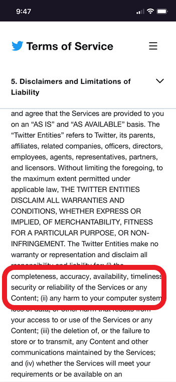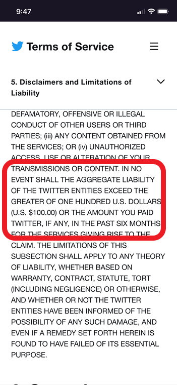 Its two main elements are part of the Limitation of Liability (LoL - no, really, that's what lawyers call it: the LOL): products are provided "as-is" at "our own risk" and there are no guarantees on the security of the service (see highlighted below). The second part of the LoL, in all capitals like somebody yelling in MSN Messenger so you know they mean business, restricts damages to $100 USD in case of a lawsuit. In other words: if Twitter gets hacked, they expect users to settle for $100 USD in a class action lawsuit. This is actually a pretty good deal considering Canadian restaurant chain Tim Horton's got away with "free coffee and donuts" for unauthorized geolocation data collection.